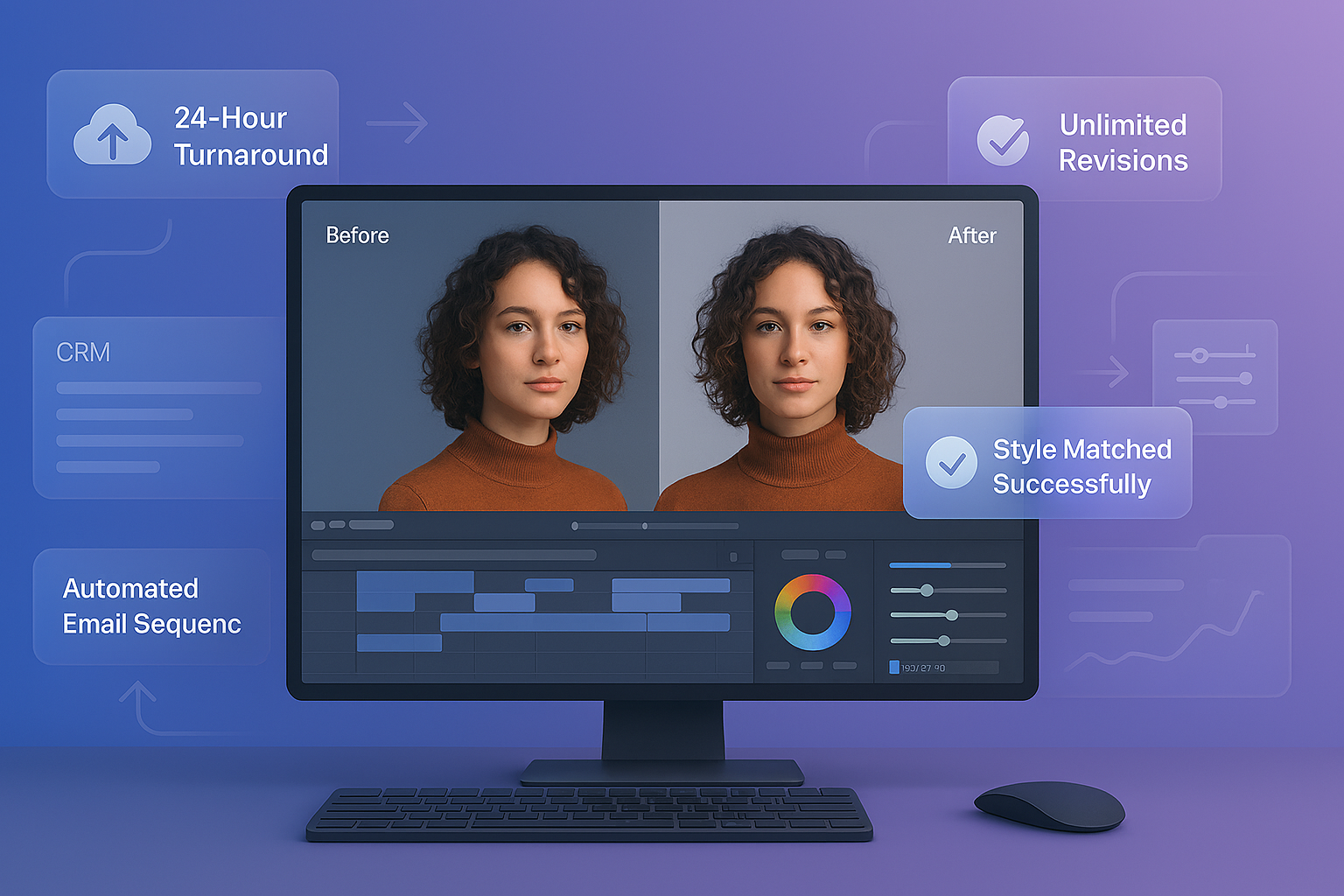 Specific outreach campaigns for wedding, fashion, or real estate photography clientsStudio‑quality retouching that elevates your brand visuals.